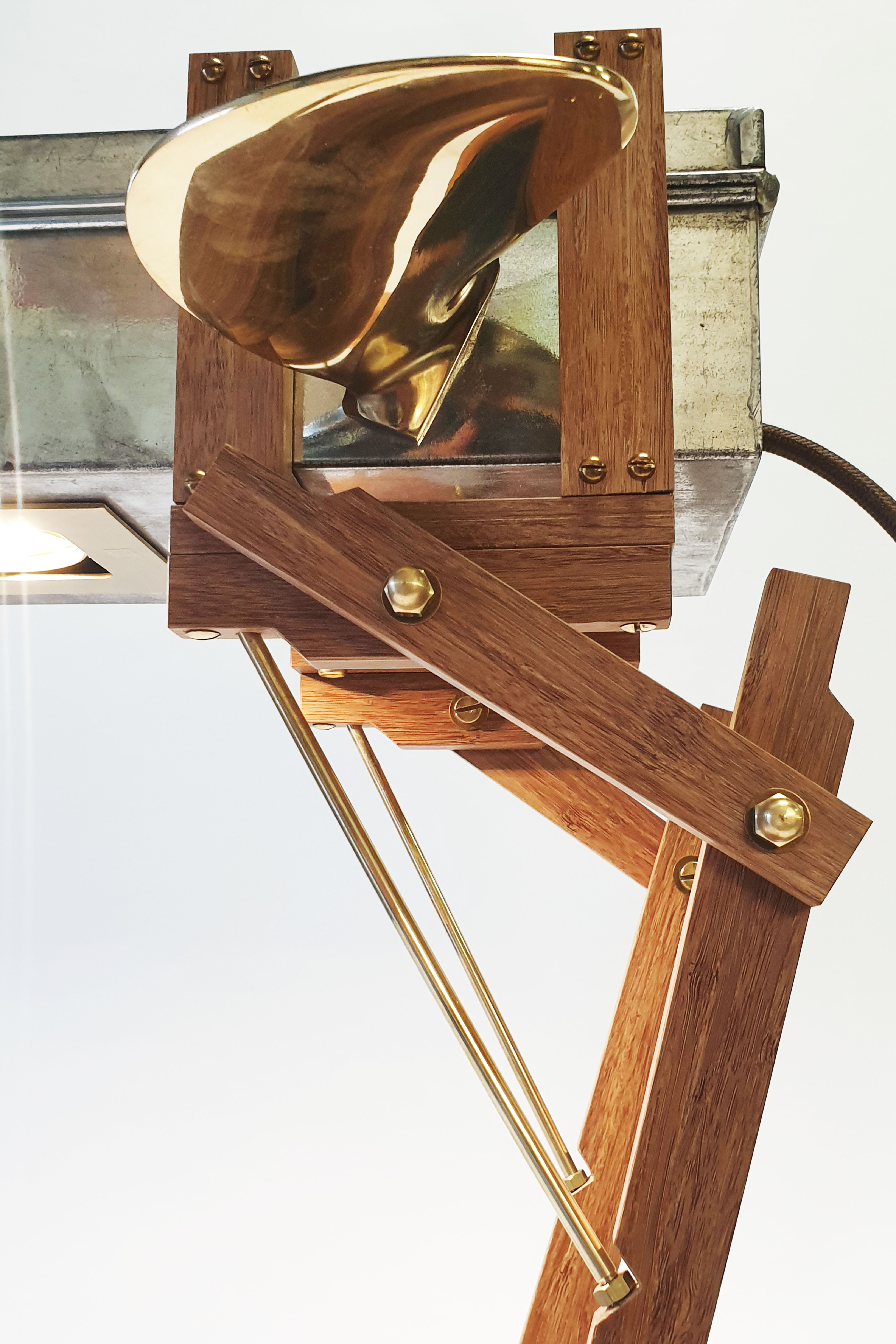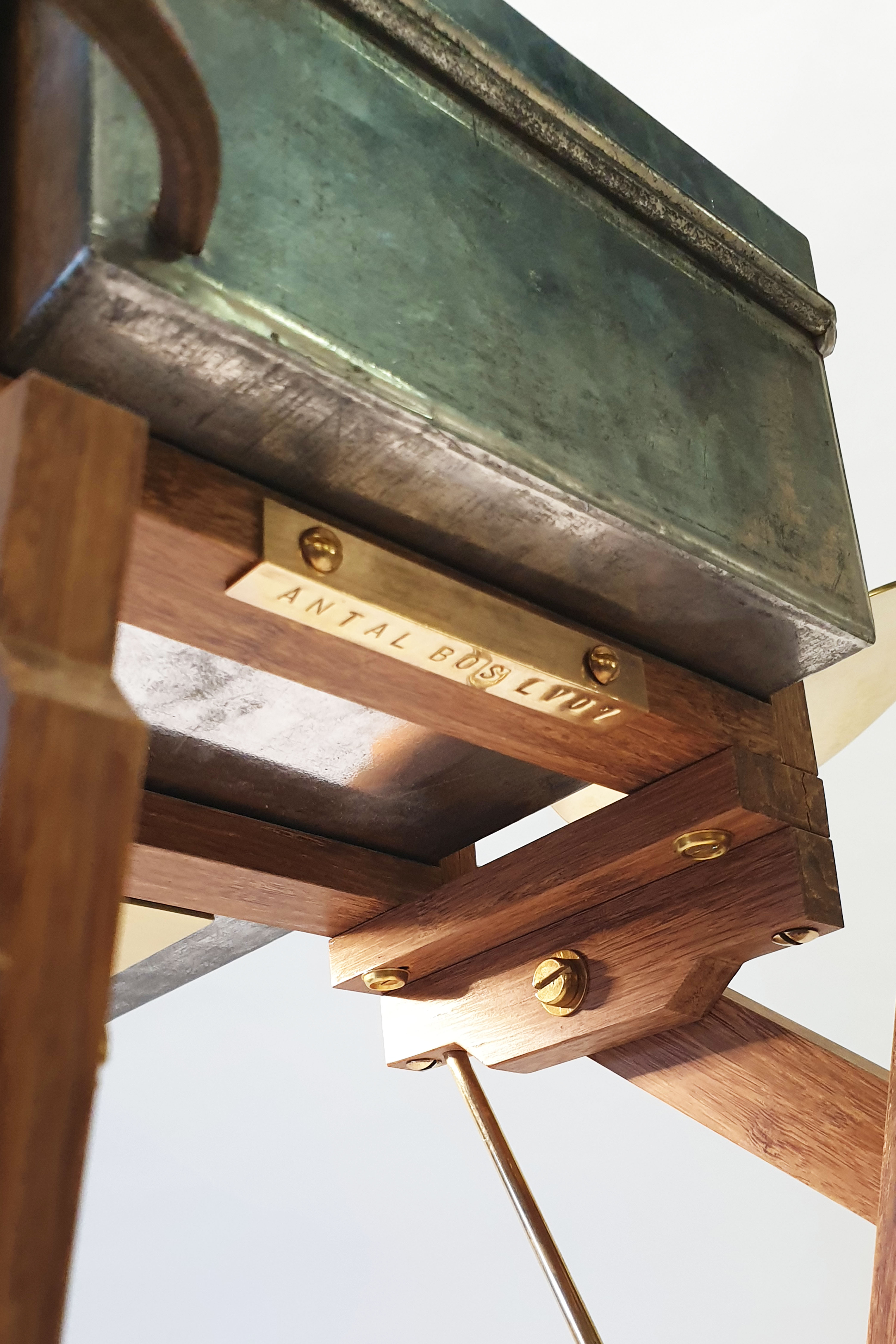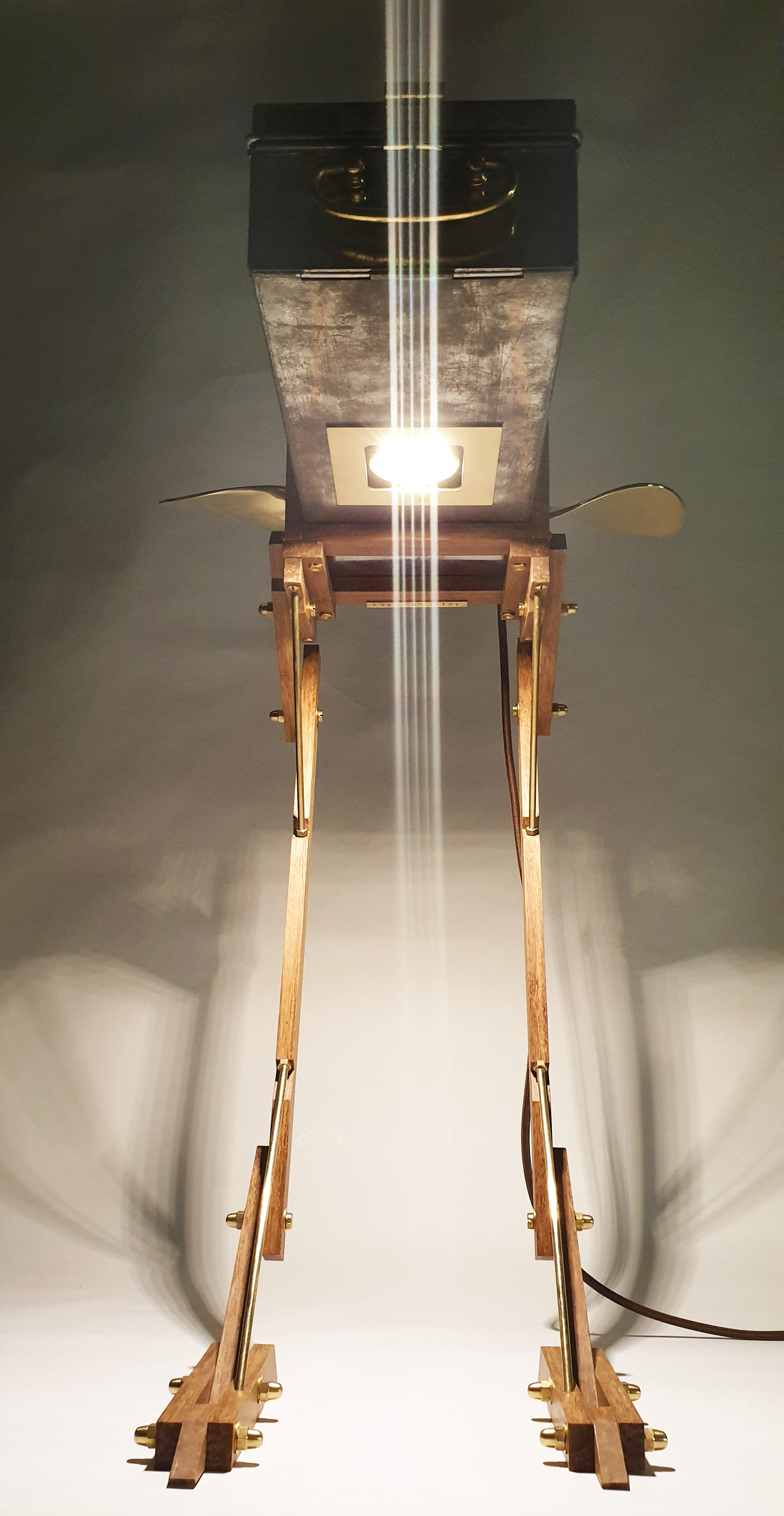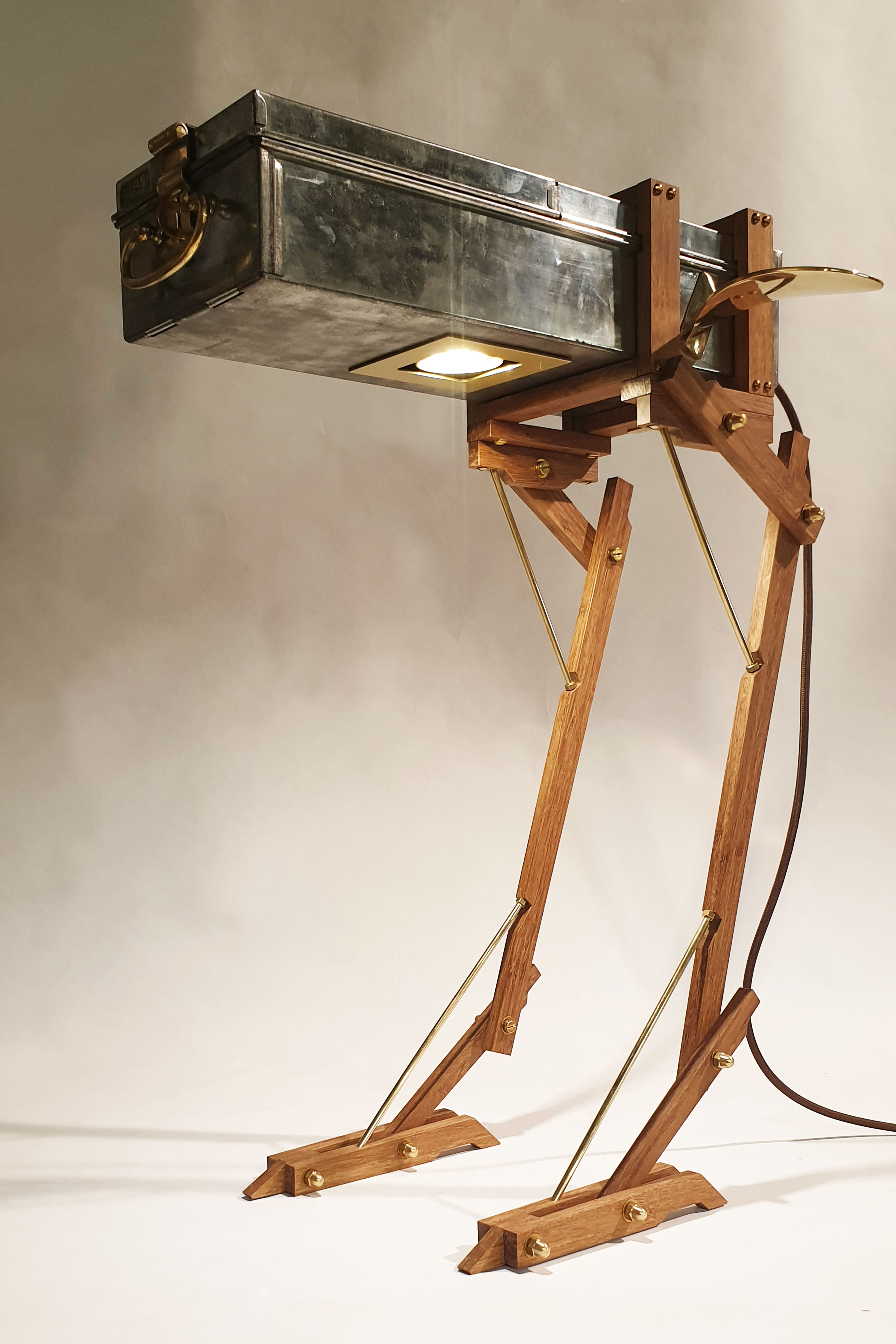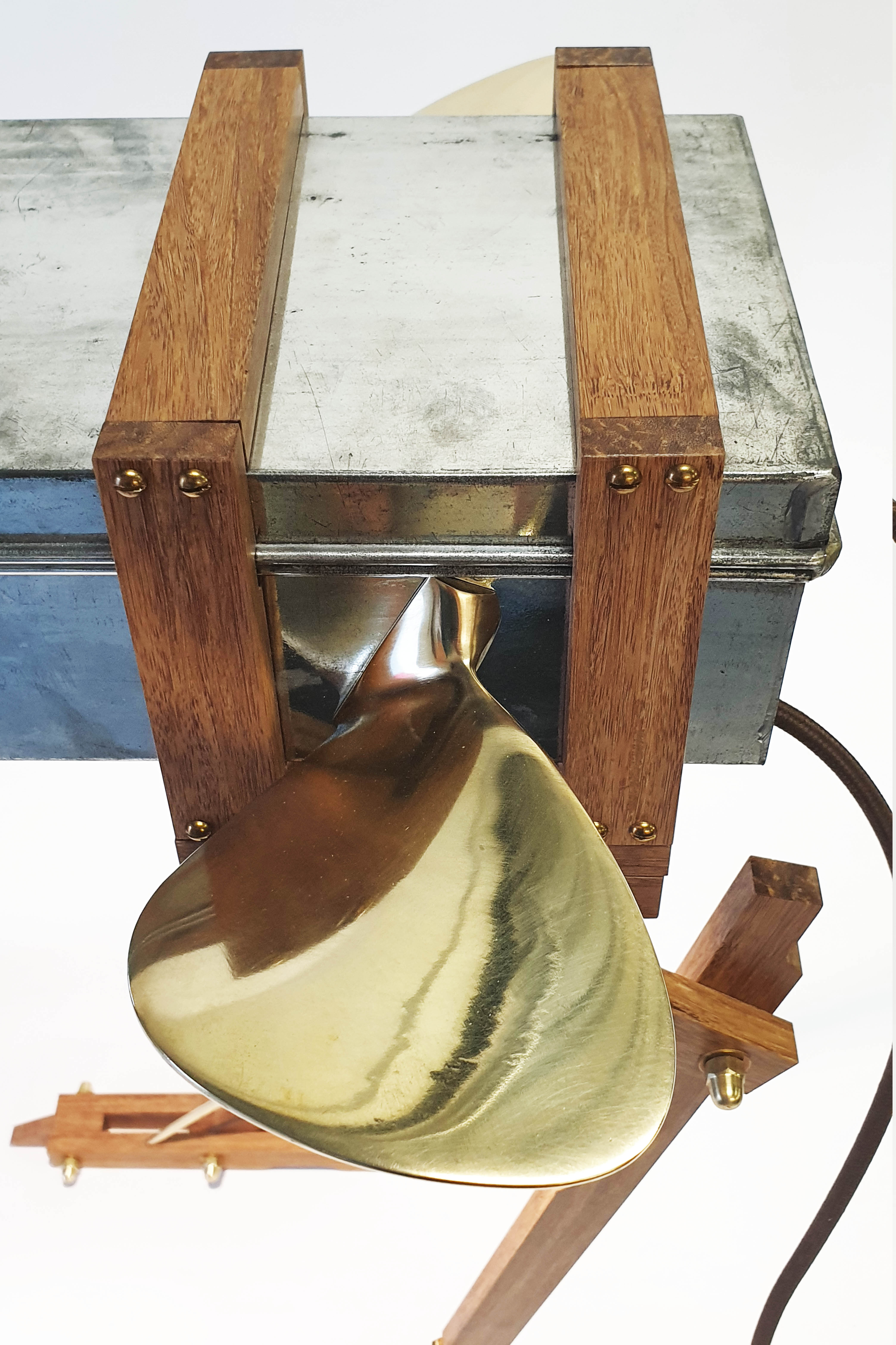 Cabinet made from a modified safe box, used by ABN Amro Bank from 1950 till 2000. The wings are made of a old brass boat propellor. The legs are made of bamboo and brass. Dimension safe box: L: 43cm W: 16cm H: 9cm. Total height, including legs: 64cm. Made in 2020